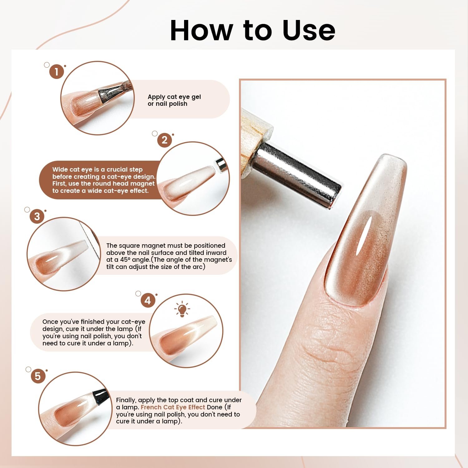 Position the magnet at different angles and distances from the nail to create diverse cat eye gel polish effects. For side glow, place the magnet on the side of the nail. For French tip, position the magnet at the tip.