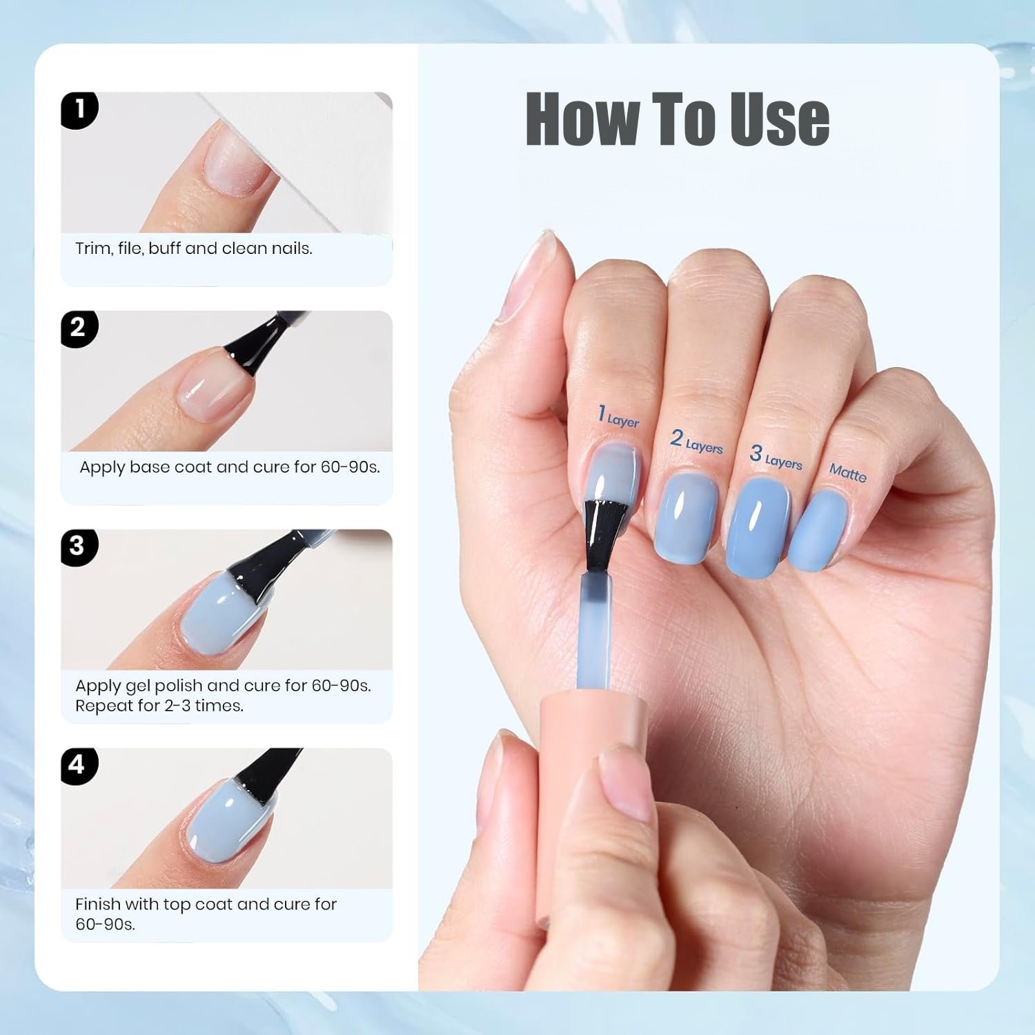 Introducing BVGEL’s Shimmer Blueberry Milk Nails Sheer Translucent Gel Polish shines to your nails, or can be matched with our wide range of colorful gel nail polish or glitter powders to create the perfect look.