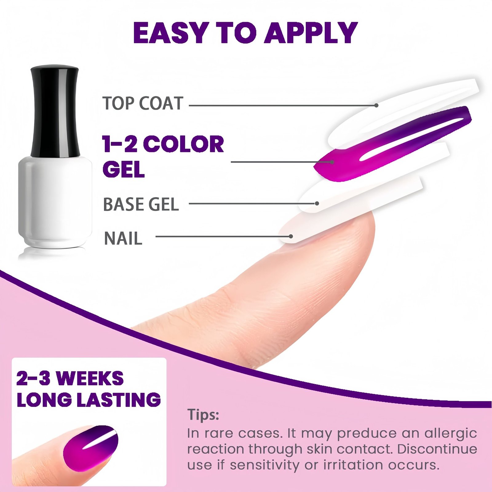 • BVGEL’s Bright Purple Mood Temperature Change Gel is made of natural resin,which makes it low odor,highly pigmented and good tenacity. Non toxic and non irritating materials are very safe to use,without damaging the nail bed and your skin.It can also effectively prevent nails chipping and breakage. If used correctly,it can keep long lasting for 21days