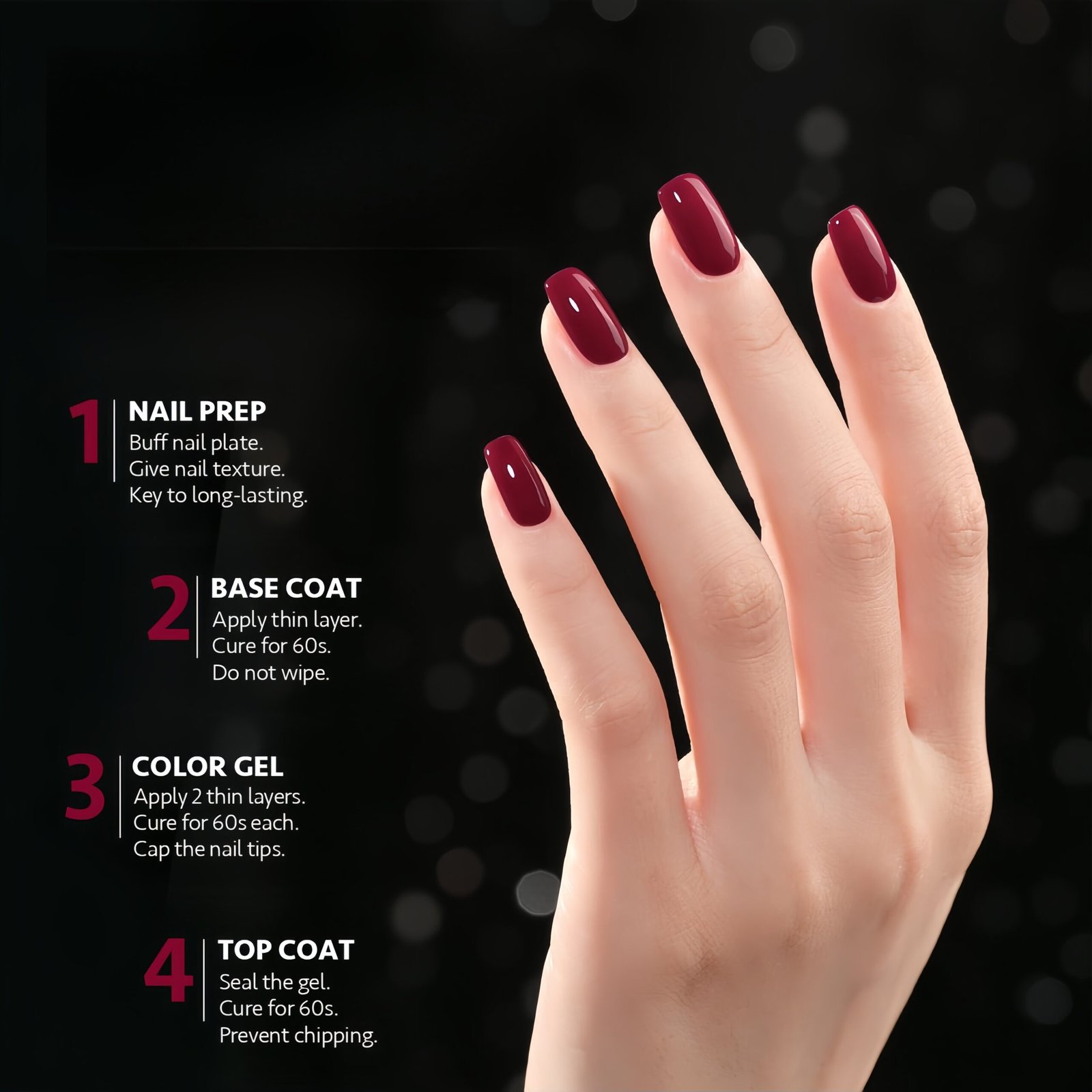 • TIPS: Buff your nail bed lightly before applying to prevent early peeling off.