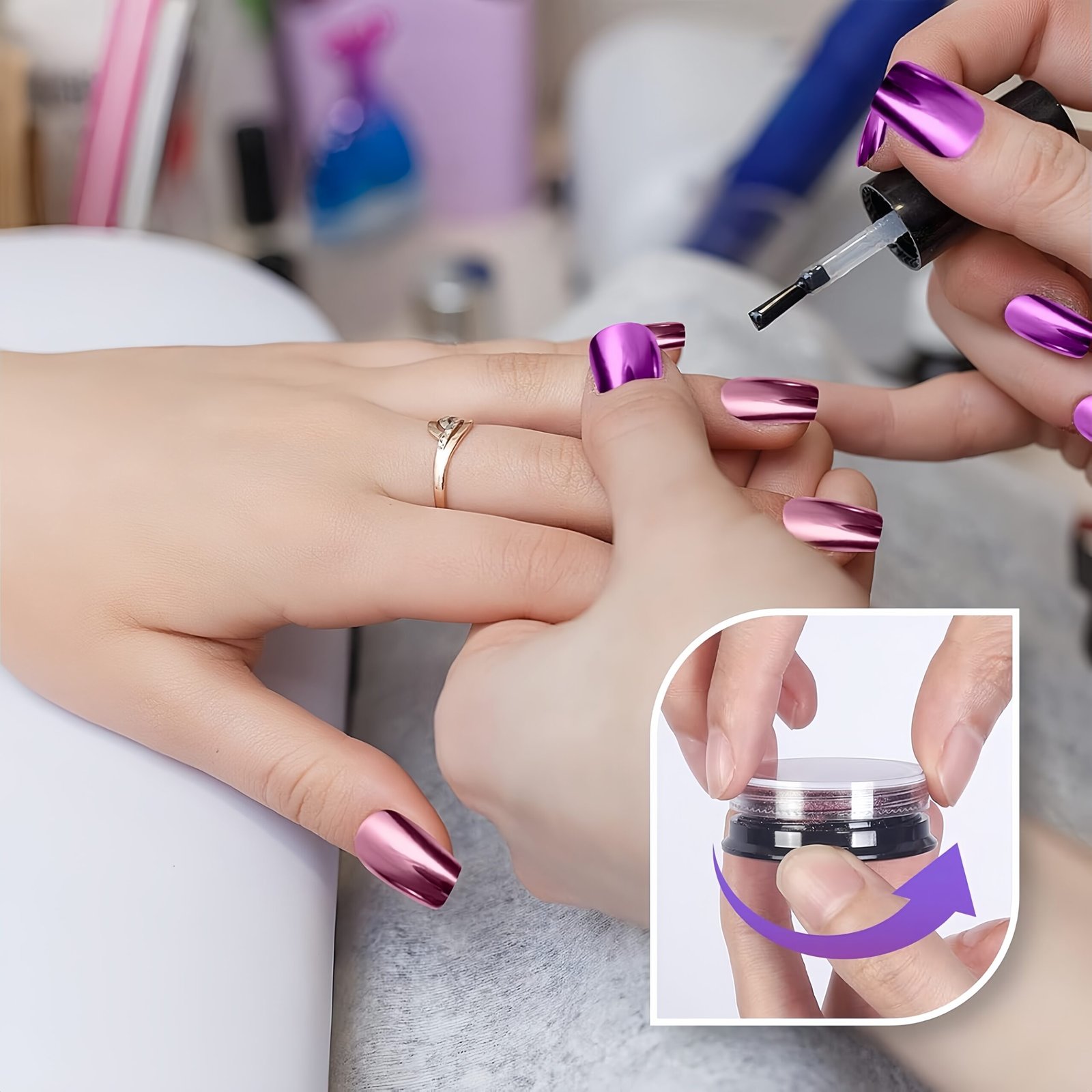 • These Mirror Chrome Nail Powder Nail Artneed to be used with Gel nail polish(color gel,gel base coat and glossy gel top coat). Some regular Polish can also be used, but not all. These powders can be used on natural nails, UV gel nails, acrylic nails or false nail tips. You can use them very easily. It is a good solution with rhinestones ,nail art fimo or other accessories to build a nice nail art.