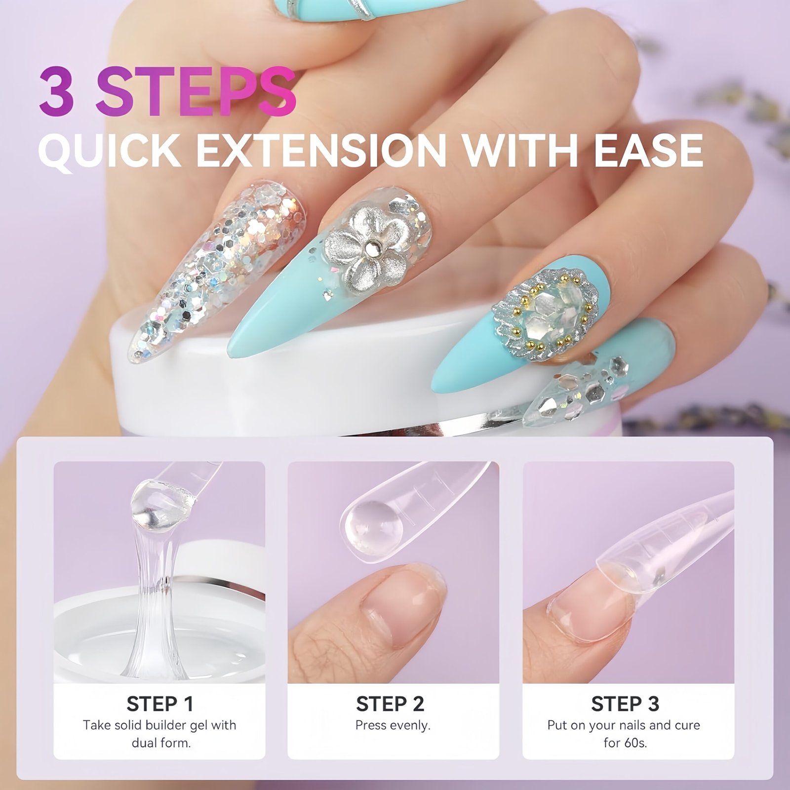 • This solid nail gel kit includes clear solid builder nail gel, nail sequins, chrome nail powders for stunning metallic effects, double-head silicone pen for 3D nails, 1 nail buffer for pre-manis. This solid nail glue is friendly for nail beginners and nail lovers.