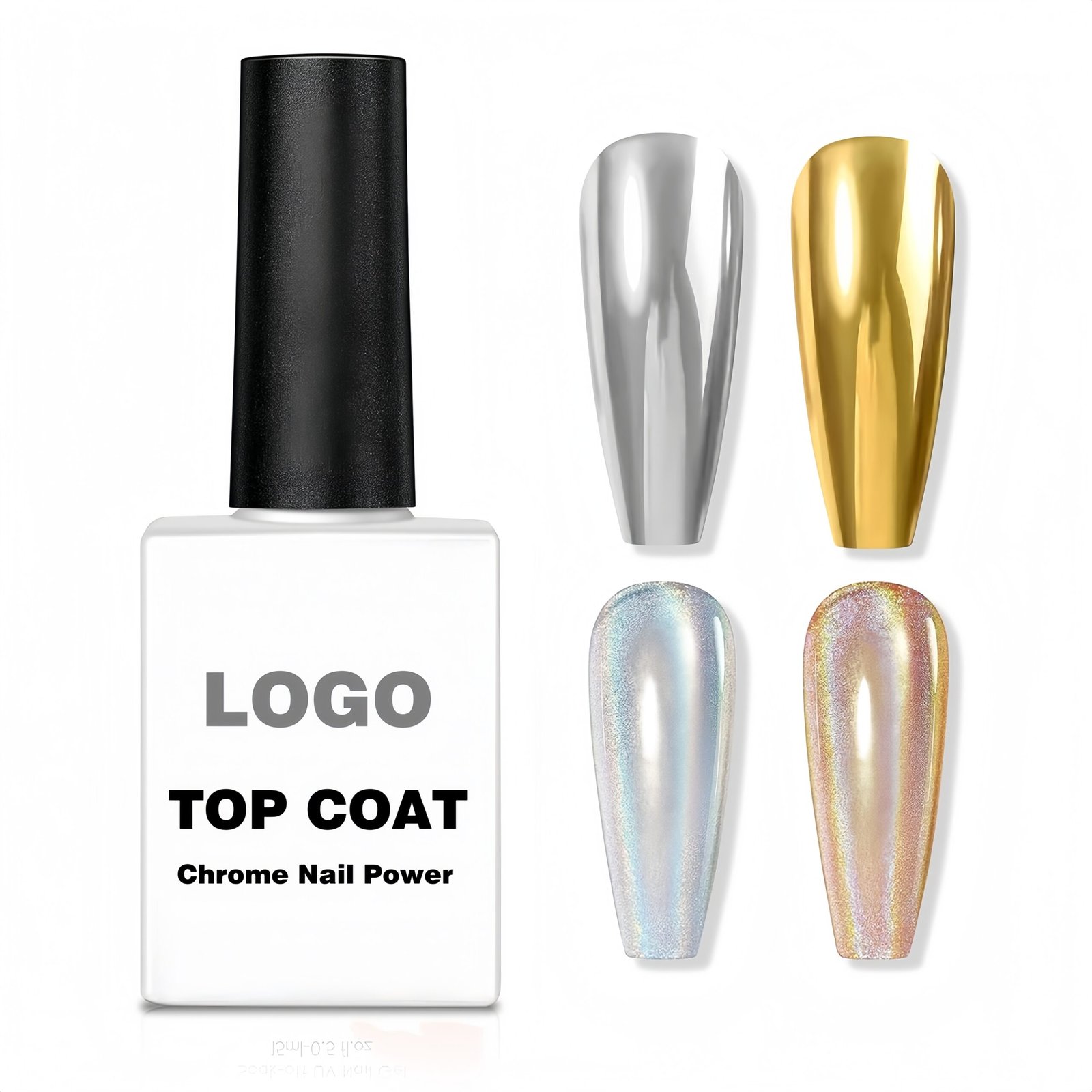 This Top Coat for Chrome Nail Powder is specially formulated for the effortless application of chrome powder, mermaid powder, or holographic powder, ensuring your nails achieve a dazzling mirror-like shine with ease! Unlike general non-wipe top coats, the top coat helps you apply chrome powder smoothly, without any graininess or patches