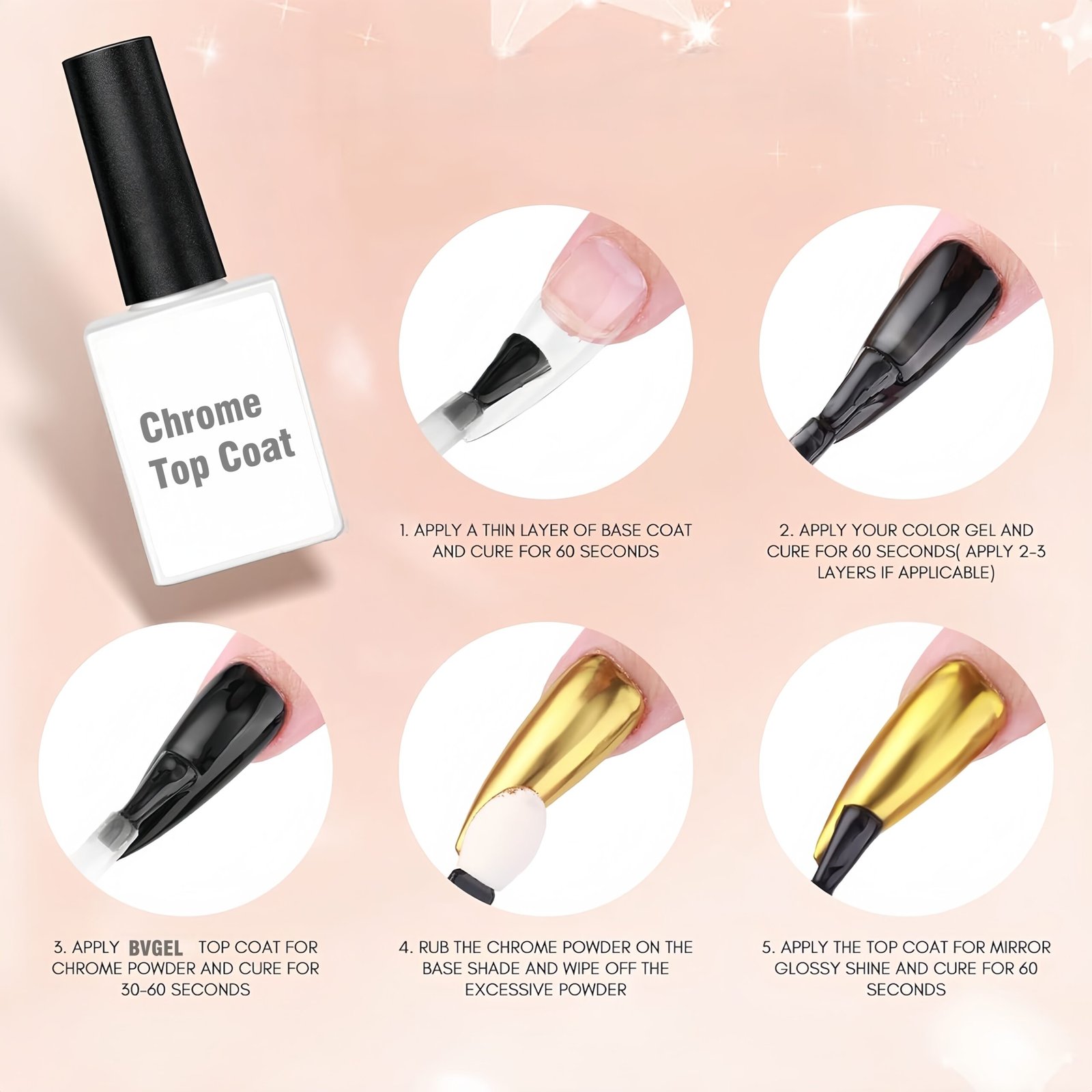 Introducing BVGel’s innovative Top Coat for Chrome Nail Powder adds a gel-polish shine to your nails, or can be matched with our wide range of colorful gel nail polish or glitter powders to create the perfect look.