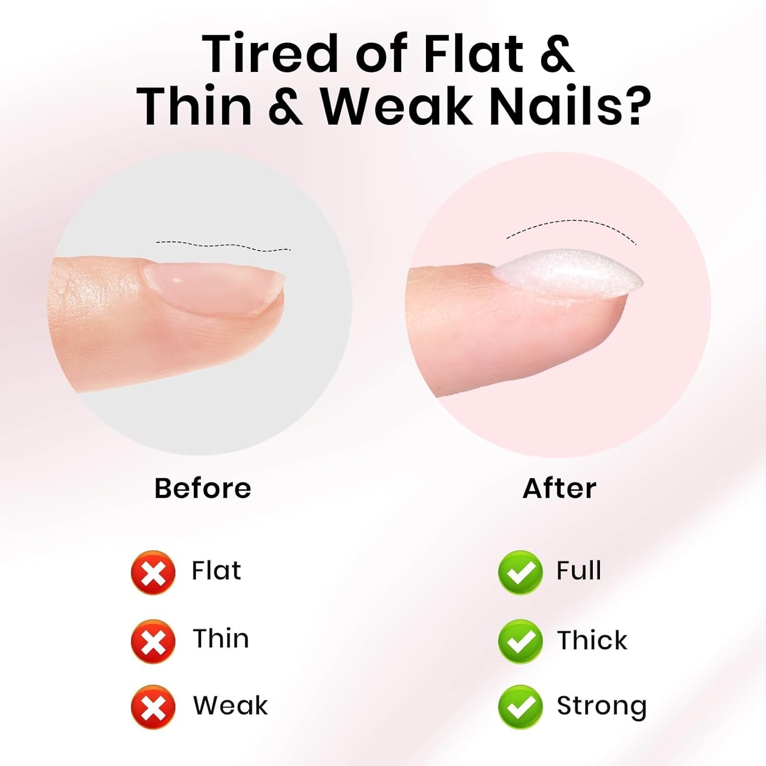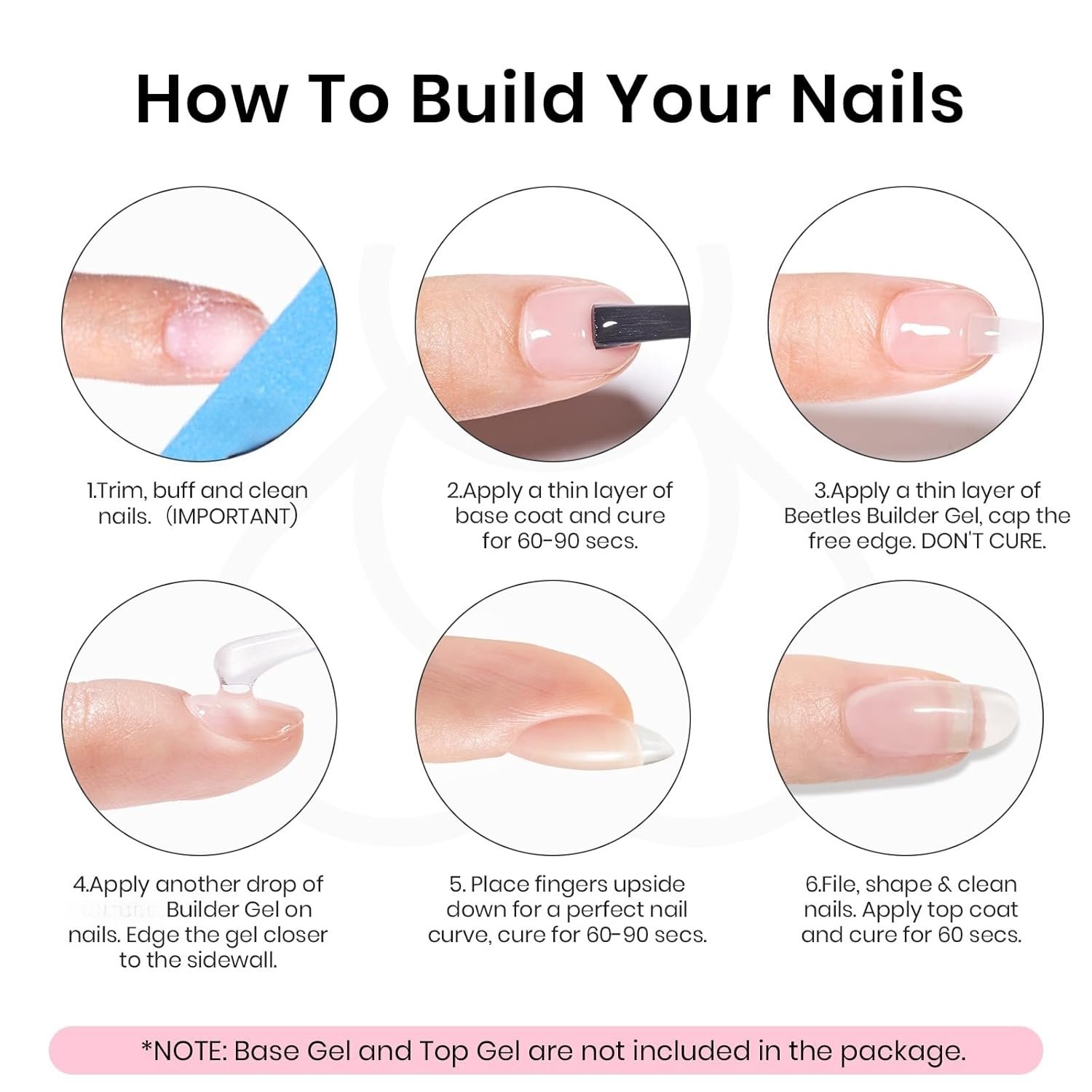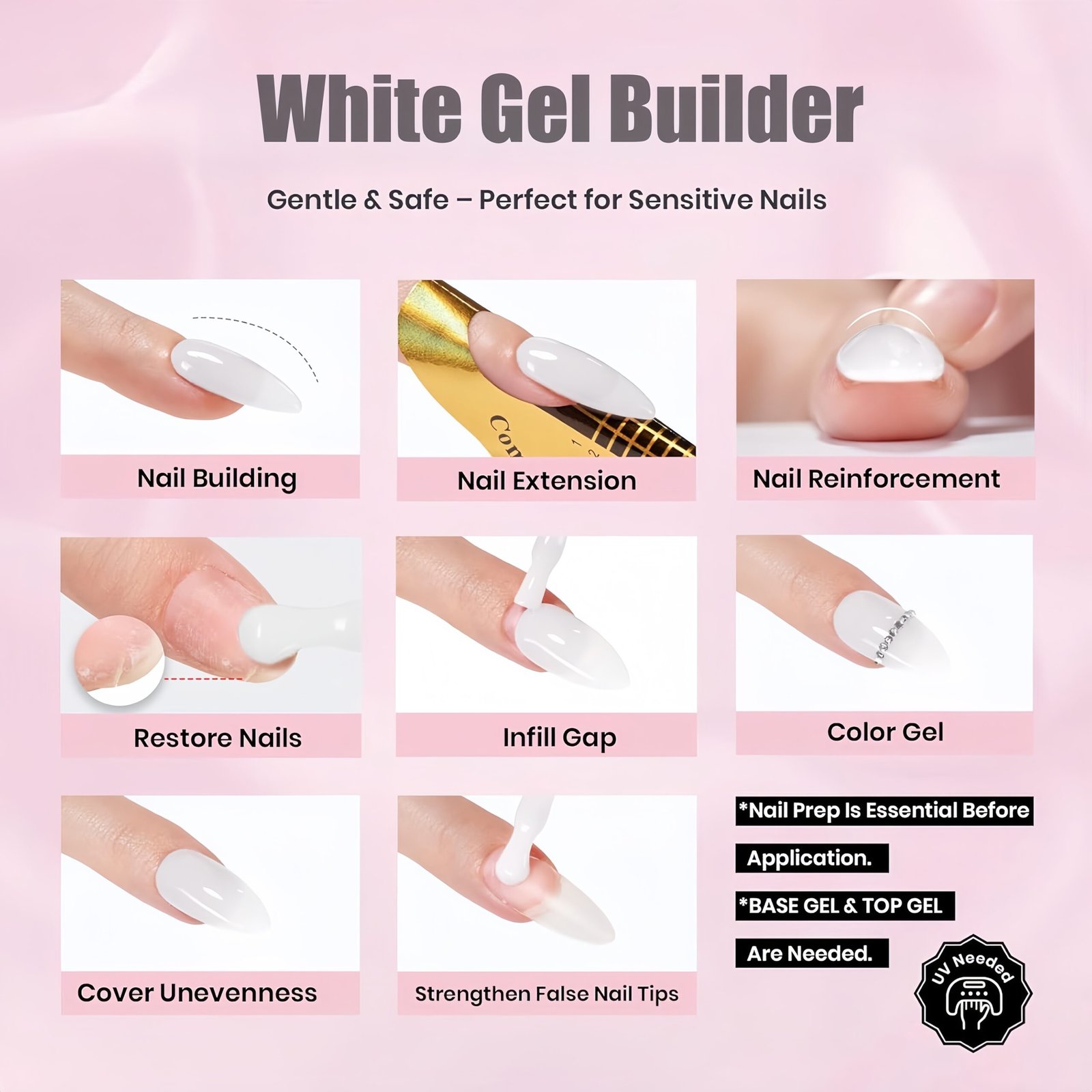 White Glitter Builder Nail Gel for Nail Extension is designed with innovative formula, this versatile clear gel builder is ideal for 7 amazing applications including as thickening overlay, building apex, extending length, shaping nail, to attach false nail tips ,gems , jewels and as a base gel. Note: Need to be cured under UV or LED lamp for 60-90s.